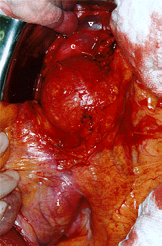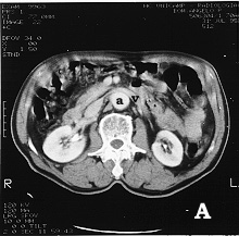 Figura 1: Tomografia computadorizada de abdome com contraste. A - imagem da aorta (a) na altura da veia renal E (v), revelando um calibre normal abaixo das artérias renais. B - imagem do maior diâmetro do aneurisma (a), com ausência de trombo mural, e C - imagem do aneurisma de ilíaca D (a1) com presença de trombo mural (t) e ilíaca E com diâmetro pouco aumentado (a2). |